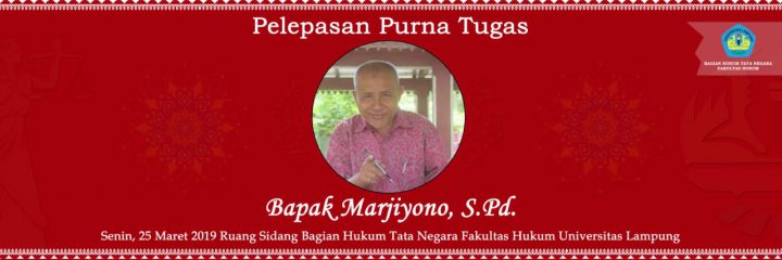Pelepasan Purna Tugas “Marjiyono, S.Pd.” oleh Bagian HTN Senin, 25 Maret 2019 bertempat di ruang Sidang Bagian Hukum Tata Negara, Bagian Hukum Tata Negara Fakultas Hukum Universitas Lampung menyelenggarakan Pelepasan Purna Tugas Bapak Marjiyono, S.Pd. Dr. Budiyono, S.H., M.H. selaku Ketua Bagian HTN menyampaikan bahwa kegiatan ini dilakukan sebagai bentuk ucapan terimakasih atas semua […]