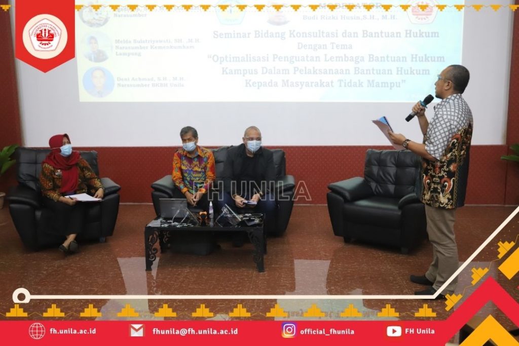 Bidang Konsultasi dan Bantuan Hukum Universitas Lampung melaksanakan kegiatan Seminar dengan Tema “Optimalisasi Penguatan Lembaga Bantuan Hukum Kampus dalam Pelaksanaan Bantuan Hukum Kepada Masyarakat tidak mampu”.