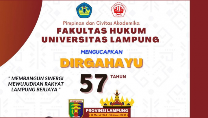 Segenap Pimpinan dan Civitas Akademika Fakultas Hukum Universitas Lampung mengucapkan Dirgahayu Provinsi Lampung ke 57 Tahun, Jaya selalu Lampungku.