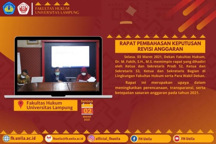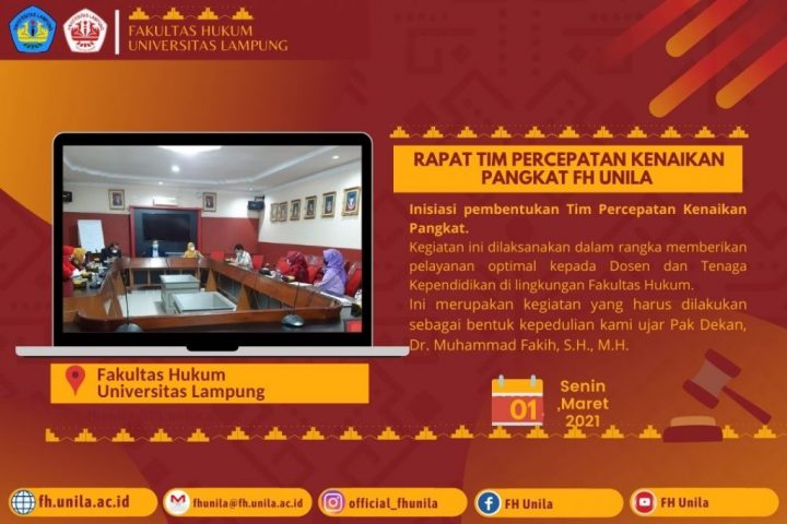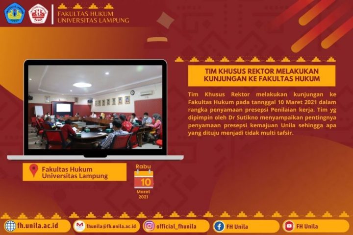 Tim Khusus Rektor melakukan kunjungan ke Fakultas Hukum pada tannggal 10 Maret 2021 dalam rangka penyamaan presepsi Penilaian kerja. Tim yg dipimpin oleh Dr Sutikno menyampaikan pentingnya penyamaan presepsi kemajuan Unila sehingga apa yang dituju menjadi tidak multi tafsir.