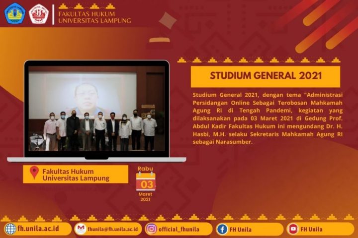 Studium General 2021 di Ruang Prof. AbdulKadir Muhammad, S.H. dan via Zoom meeting, Fakultas Hukum Universitas Lampung, Selasa (2/03) dengan tema Pemaafaan Dalam UU ITE Sebagai Penghapus Pidana Dalam Rangka Keadilan Restoratif