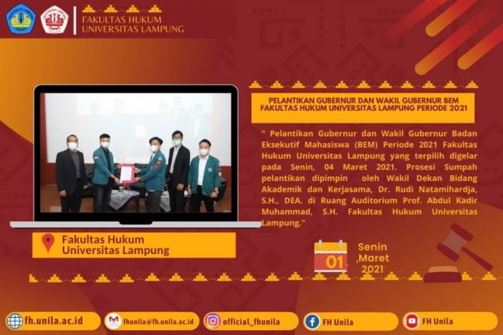 Pelantikan Gubernur dan Wakil Gubernur Badan Eksekutif Mahasiswa (BEM) Periode 2021 Fakultas Hukum Universitas Lampung yang terpilih digelar pada Senin, 04 Maret 2021.