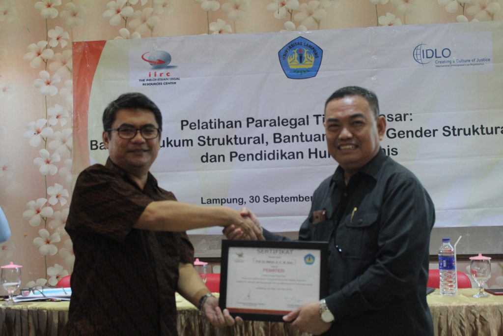 Penyerahan Piagam oleh Direktur Eksekutif ILRC kepada Pemateri