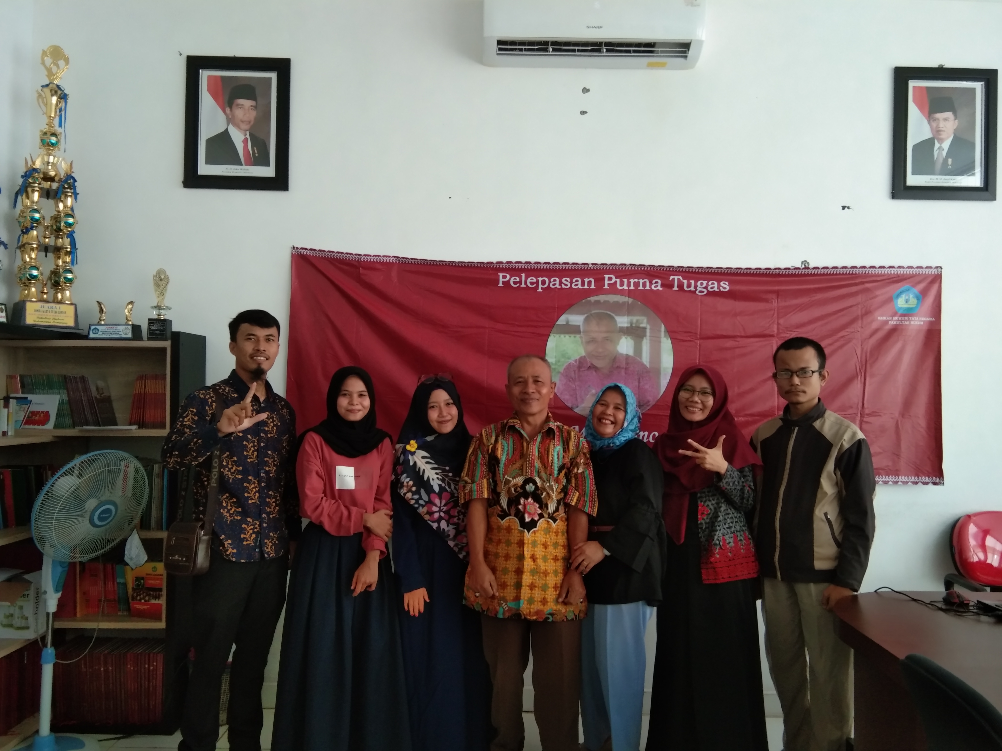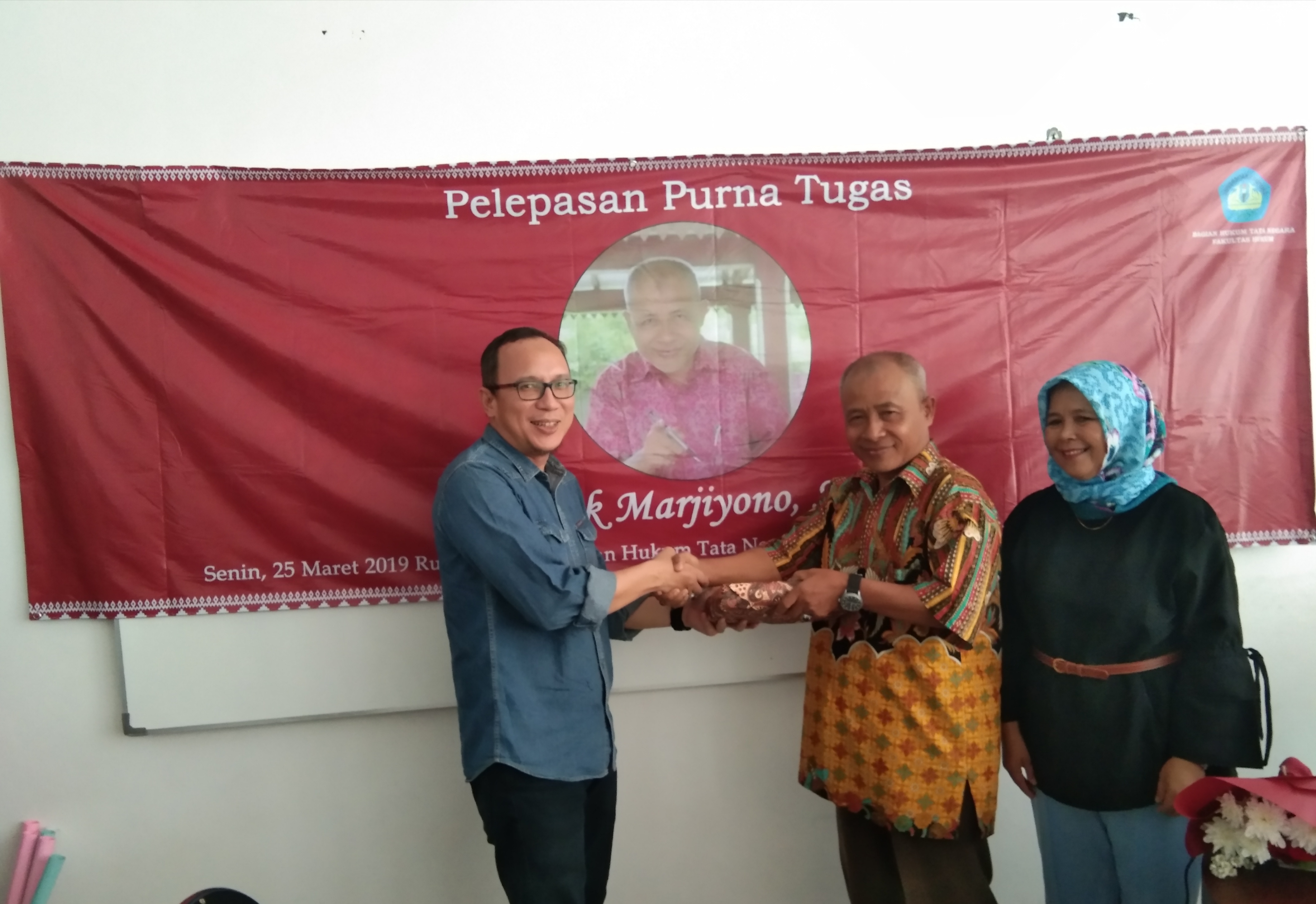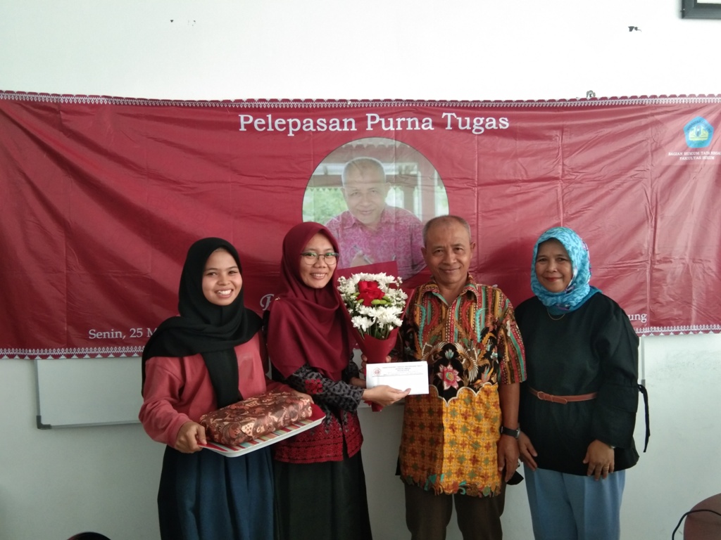 Senin, 25 Maret 2019 bertempat di ruang Sidang Bagian Hukum Tata Negara, Bagian Hukum Tata Negara Fakultas Hukum Universitas Lampung menyelenggarakan Pelepasan Purna Tugas Bapak Marjiyono, S.Pd. Dr. Budiyono, S.H., M.H. selaku Ketua Bagian HTN menyampaikan bahwa kegiatan ini dilakukan sebagai bentuk ucapan terimakasih atas semua dedikasi bapak Marjiyono kepada Bagian Hukum Tata Negara selama hampir 16 Tahun