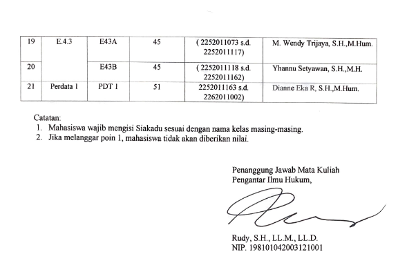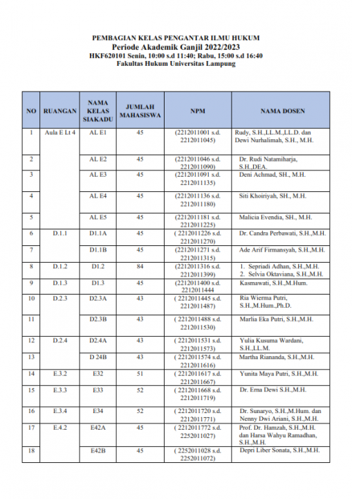 [Pengumuman] Pembagian Kelas Pengantar Ilmu Hukum Periode Akademik Ganjil 2022/2023