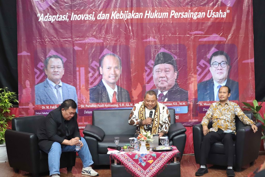 Acara ini dibukalangsung oleh Dekan FH Unila, Dr. M. Fakih, S.H., M.S., yang menekankan pentingnya hukum yang mampu mengikuti perkembangan zaman, terutama di tengah cepatnya perubahan ekonomi digital. Seminar ini juga jadi ajang penting memperkuat hubungan antara FH Unila dan FH UI dan KPPU. Dalam sesi pertama, Bapak Budi Joyo Santoso, S.E., M.M., Anggota KPPU RI, membahas bagaimana lembaganya mengawasi persaingan usaha agar tetap sehat dan adil. Ia juga menjelaskan bahwa KPPU tidak melarang perusahaan besar, selama tidak menyalahgunakan dominasinya.