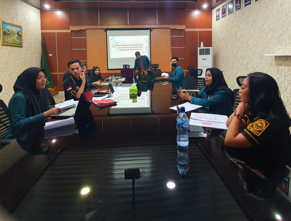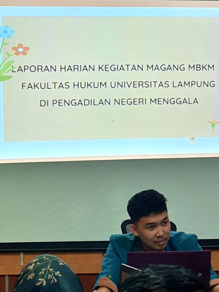 Mahasiswa Magang MBKM FH Unila melaksanakan kegiatan pelaporan harian setiap minggunya di hari Jumat. Kegiatan laporan harian ini dimulai pada pukul 16.00 WIB di ruang Teleconference PN Menggala. Setiap mahasiswa yang magang di PN Menggala, akan mengikuti kegiatan ini. Hal ini adalah kebijakan dari pak Ketua PN Menggala, Jimmy Maruli Alfian, S.H., M.H. dan juga para hakim yang terlibat dalam proses pembimbingan mahasiswa.